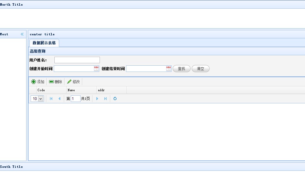 <!--由於查詢需要輸入條件,但是以toolbar的形式不好,所以我們在Layout框架的頭部north中書寫查詢的相關信息-->