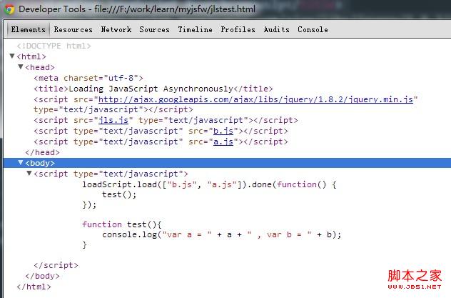 轉到Elements面板,我們可以看到b.js和a.js被順序地加到了head中: