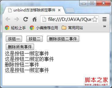 1、在DOM對象的實踐操作中,既然存在用於綁定事件的bind方法,也相應存在用於移出綁定事件的方法,在JQuery中,可以通過unbind方法移除所有綁定的事件或某一個事件。