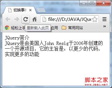 <div class="clsContent">JQuery是由美國人John Resig於2006年創建的一個開源項目,它的主旨是:以更少的代碼,實現更多的功能</div>