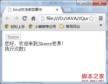 1、bind()功能是為每個選擇元素的事件綁定處理函數,其語法如下:bind(type, [data], fn)