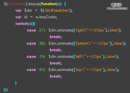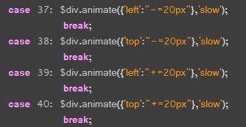 題目:按下方向鍵時,使層向相應的方向平滑移動20像素;四個方向鍵的鍵碼分別是37(左)、38(上)、39(右)和40(下)。