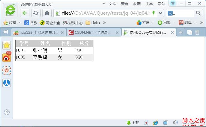 3、使用JQuery選擇器實現隔行變色,示例代碼如下: