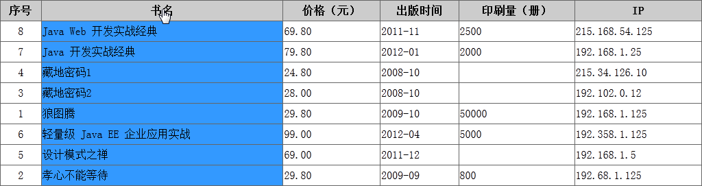 該實現的主要思想是:獲取鼠標點擊的表頭單元格的列號,遍歷數據行,獲取每個<tr>中的html,同時獲取每個<tr>標簽下對應獲取到的列號的<td>標簽中的內容,並取得<th>標簽的type屬性值,將獲取<tr>的html、<td>的內容和<th>的type屬性值拼接成字符串添加到數組array中,然後將表格<tr>中的html全部置空,根據type屬性值的不同采用不同的方法對<td>的內容進行比較,根據比較結果對數組array進行排序,然後將排序後的數組元素重新賦值給已經置空的<tr>。如果已經對該列排序過了,則直接對數組進行倒置。提供數值、字符串以及IP地址三種類型的排序規則。字符串類型排序規則采用javascript的localeCompare方法,該方法支持漢字字符串的排序,遺憾的是該方法不兼容谷歌浏覽器。所以在谷歌浏覽器上漢字字符串的排序結果會不正確。