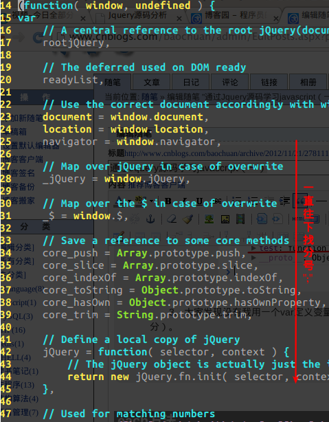 3、用一個var定義變量,函數。Jquery源碼裡用了79行定義了一連串的變量(在開頭部分)。