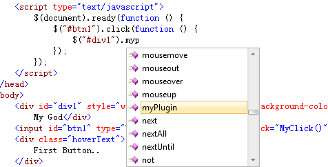 怎麼用呢?很簡單。 新建一個html頁面,把jquery文件以及剛剛我們MyPlugin.js文件導入到本次頁面中。如下: