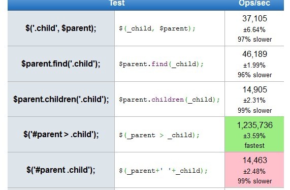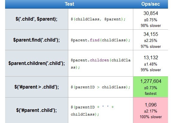 在其所給的測試用例中 確實是使用jquery的find方法最快,但是稍作修改卻得到了另外的一個結果$('#parent > .child')完勝。