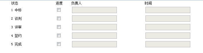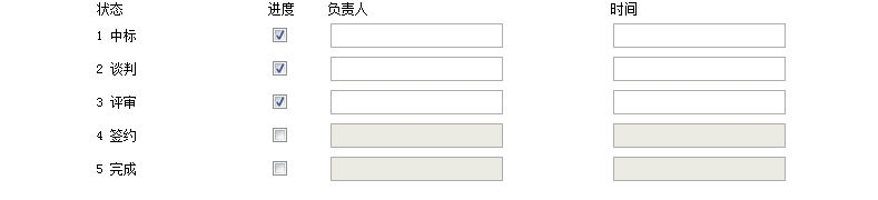狀態共有5中,要求點擊某個狀態的復選框時,這個狀態和它之前的狀態的文本框都可以編輯,之後的文本框都不可以編輯,如圖示