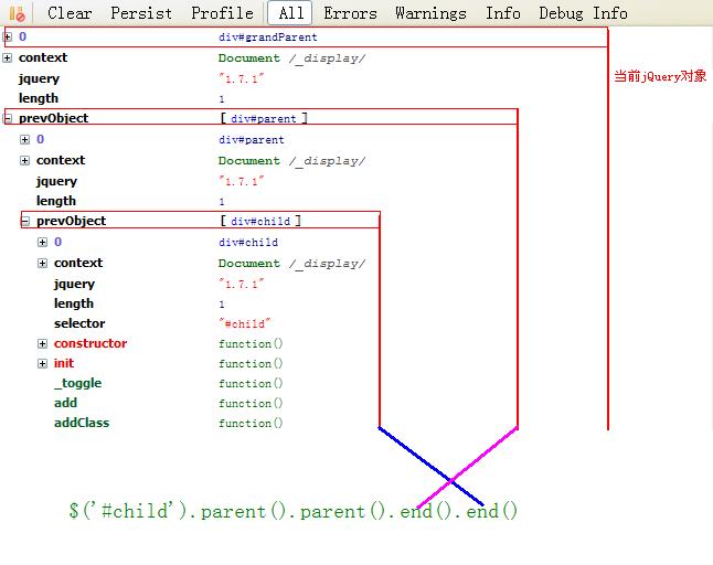 很顯然, 大多數情況下這不是我們想要的, 事實上我們想通過鏈式調用end()直接返回到jquery[div#child]. 現在該是pushStack出馬的時候了,我們只要加上一行即可: