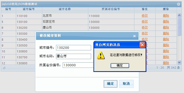 修改的操作使用了jquery ui 的 dialog彈窗, 運行效果如下:(圖上彈出的alert框是我點擊確定按鈕後彈出的,也就是說要修改數據,在這個確定按鈕事件中進行)