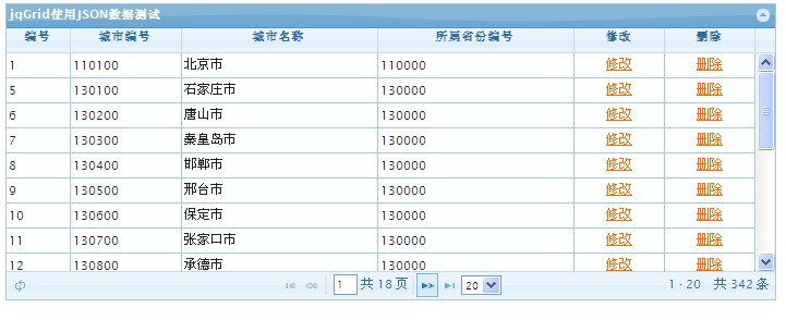 我這裡用的不是jqGrid的自帶的編輯和刪除操作,我已經把分頁導航欄下的編輯,刪除,搜索都取消掉了,就是這句$("#list1").navGrid("#pager1",{edit:false,del:false, search:false}), 然後在數據加載完成後,給每行添加了 修改和刪除鏈接