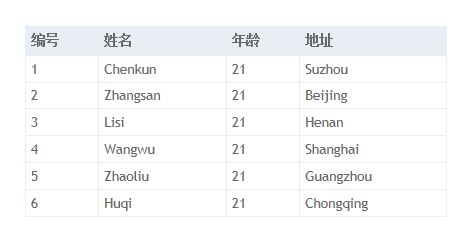 <tr><th>編號</th><th>姓名</th><th>年齡</th><th>地址</th></tr>