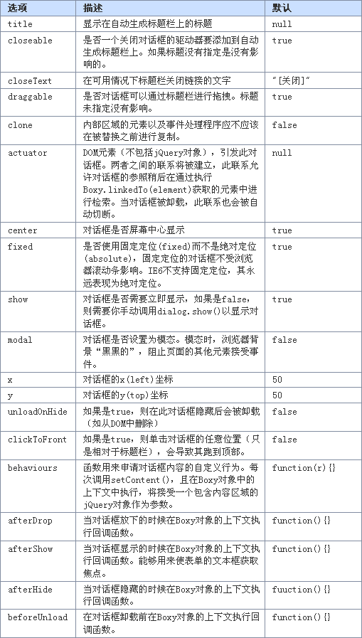 構造函數;創建一個新的boxy對話框。element是對話框的內容;任何有效的參數,jQuery的$()函數在這裡也是有效的。options是一個配置選項的散列,見下面詳細的資料。