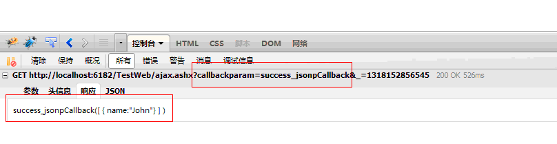 success_jsonpCallback([ { name:"John"} ] ); ————其實就是,調用jsonp回調函數success_jsonpCallback,並將要響應的字符串或json傳入此方法(作為參數值),其底層的實現,大概的猜想應該是: