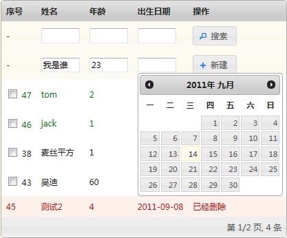 這裡需要說明 {state} 和 {sort} 的語法, 分別為 {state[,<未改變行樣式>[,<新建行樣式>[,<修改行樣式>[,<刪除行樣式>]]]]}, {sort,<排序字段>[,<無排序樣式>[,<升序樣式>[,<降序樣式>]]]}. 對於 {state} 而言, 如果沒有指定某種狀態的樣式, 則將使用行的狀態名稱來代替樣式名稱, 比如: {state,,new-item}, 由於沒有指定未改變行的樣式, 因此如果行的狀態為 unchanged, 那麼將返回 unchanged. 對於 {sort} 而言, 如果沒有指定某種排序的樣式, 將采用排序的狀態來代替樣式名稱.