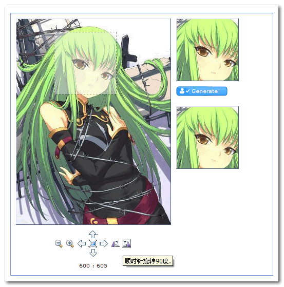 使用一張C.C的圖來截取頭像, 設置截取框長寬為120:120, 容器為id為container的div, 每次旋轉角度為90, 順時針旋轉功能按鈕的提示為 '順時針旋轉{0}度.'