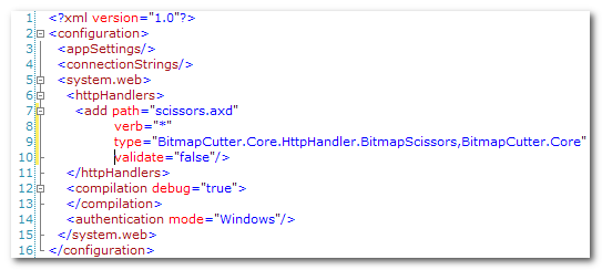 客戶端AJAX提交的Url為"scissors.axd", 實際為BitmapScissors類(如修改了服務器端處理程序, 請在Web.config中根據實際進行httpHandler節點配置), 本例為: