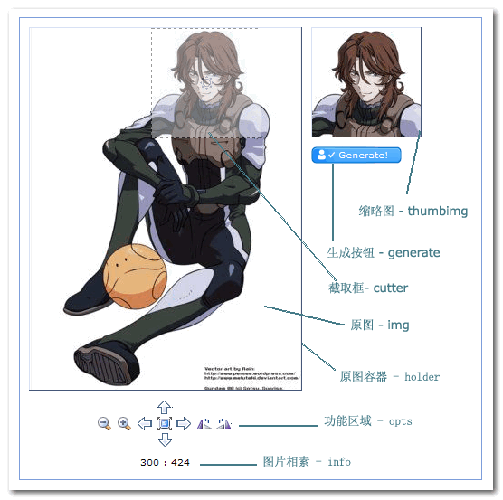 cutter為截取框, 可進行拖拽以選擇自己敢興趣的截取區域, 拖拽區域在holder容器內, 同時會在thumbimg(原理與holder+img相同)內生成縮略圖.