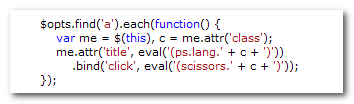 這裡我使用了一個對象scissors來封裝這些操作, 使用call來 '繼承', 當然你也可以使用 '冒充' 或者 '原型鏈' 這些手段來實現. 這樣的話在綁定這些方法的時候使用eval和json就可以很輕松的完成: