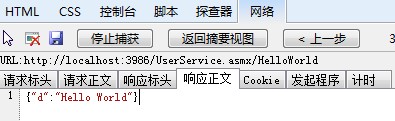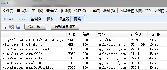 注意上面獲取數據的方式:result.d,這是因為在返回的json數據格式是以d為鍵值的json對象。可以通過IE 9的開發人員工具,按下F12,選擇網絡,點擊開始捕獲按鈕,重新刷新一下頁面可以看到所有的請求列表,如下圖所示: