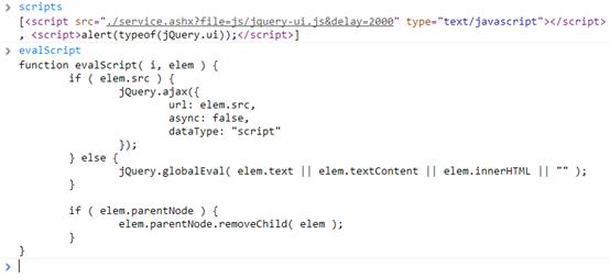 這裡的value是字符串:"<script src="./service.ashx?file=js/jquery-ui.js&delay=2000" type="text/javascript"></script><script>alert(typeof(jQuery.ui));</script>"