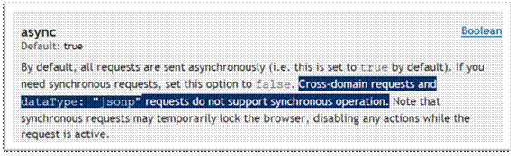 大家有沒有從上面的分析中發現問題,AJAX來加載其他域的資源,這不是明擺著違背了大名鼎鼎的同源策略(Same Origin Policy)了麼?所以jQuery不可能這麼實現,我們來看看jQuery.ajax文檔是怎麼說的: