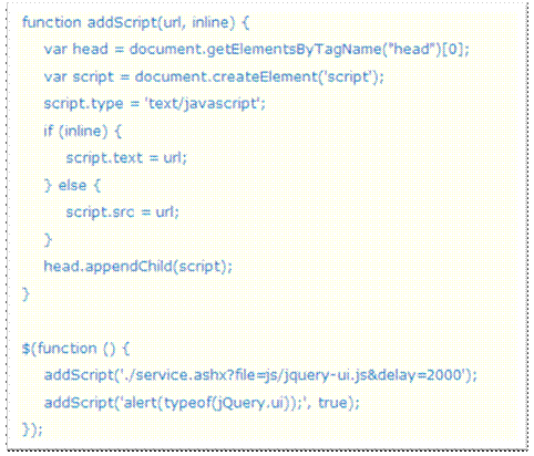 $('#container').html('<script src="./service.ashx?file=js/jquery-ui.js&delay=2000" type="text\/javascript"><\/script>' + '<script>alert(typeof(jQuery.ui));<\/script>');