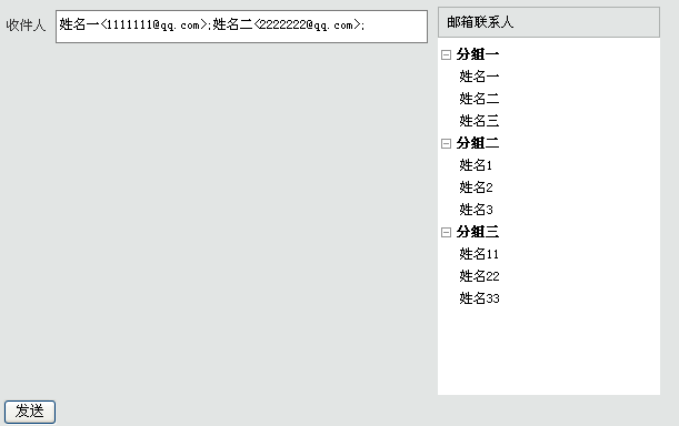 最後點擊確定,把右側的進行拼接,放到收件人的框裡,注意,這裡的框並不是文本框,是一個DIV,只是樣式寫得很像文本框,所以,我們要把姓名的email地址用不同的標簽包容起來進行區分。最後每一個以分號分隔。