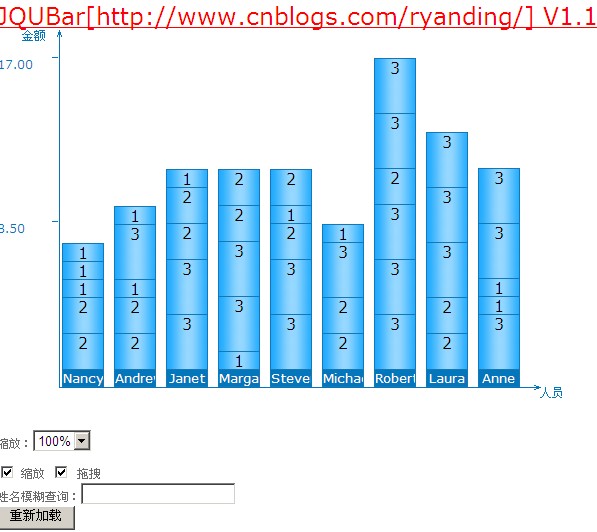 顯示JQUBAR插件頁面的html標准請使用 <!DOCTYPE HTML PUBLIC "-//W3C//DTD HTML 4.0 Transitional//EN"> ,MVC2.0 C#代碼使用NORTHWIND數據庫。JQUBar1.1插件在這裡下載。