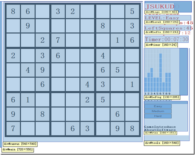 body的代碼如下,頁面主體使用main層來控制尺寸,main中包含兩個層:canvas和tools,分別用來承載數獨表格和輔助信息。tools層中嵌套了logo,level,lefts,timer,leftsg,btns,err共七個層,分別用來承載LOGO、游戲難度、剩余空格數、已用時間、剩余空格數明細、按鈕和錯誤提示信息。tools層中的樣式寫在default.css樣式文件中。canvas層、level層、lefts層、timer層、leftsg層、err層的內容由jquery控制動態生成,後續會有解釋。