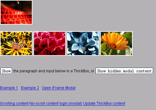 附件中index.html是主頁,其它頁面都是調用頁面。點擊index頁面,就能看到如圖的頁面。圖、按鈕、文字都是可以點的。需要點擊的標簽都要加上class="thickbox"。當頁面出現滾動條時,彈出層固定在窗口的正中間不會移動。當彈出層中只是圖片時,圖片大小會根據當前窗口的大小進行壓縮。所有的彈出層都可以按"esc"退出,除了需要點確認的彈出層外,點擊彈出層以外的地方都可以關閉彈出層。