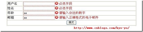 上面的代碼中我已經完成了對用戶名,姓名,年齡,郵箱的驗證了,不知道你發現了沒,就是在每個textbox中的class樣式,其中required表示必填,number表示必須是數字,email表示必須是電子郵件格式,如果寫成required email表示這個字段必須填寫同時必須是email格式。
