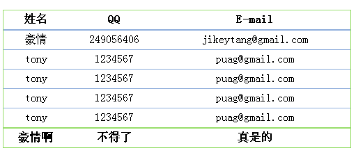 <!DOCTYPE html PUBLIC "-//W3C//DTD XHTML 1.0 Transitional//EN" "http://www.w3.org/TR/xhtml1/DTD/xhtml1- transitional.dtd"> <html xmlns="http://www.w3.org/1999/xhtml"> <head> <meta http-equiv="Content-Type" content="text/html; charset=gb2312" /> <title>豪情</title> <script type="text/javascript" src="http://ajax.googleapis.com/ajax/libs/jquery/1.3.2/jquery.min.js"></script> <style> .tab{border-collapse:collapse;border:1px solid #9BDF70;} .tab td{border-bottom:1px solid #92B0DD;text-align:center;} .tab th{border-bottom:2px solid #92B0DD;} .tab th.end{border-bottom:2px solid #9BDF70;border-top:2px solid #9BDF70;} .tab tr{height:25px;} </style> <script> $(function(){ $('#tab tr:last').find('th').addClass('end'); }); </script> </head> <body> <table id="tab" class="tab" width=500> <tr> <th>姓名</th> <th>QQ</th> <th>E-mail</th> </tr> <tr> <td>豪情</td> <td>249056406</td> <td>jikeytang@gmail.com</td> </tr> <tr> <td>tony</td> <td>1234567</td> <td>puag@gmail.com</td> </tr> <tr> <td>tony</td> <td>1234567</td> <td>puag@gmail.com</td> </tr> <tr> <td>tony</td> <td>1234567</td> <td>puag@gmail.com</td> </tr> <tr> <td>tony</td> <td>1234567</td> <td>puag@gmail.com</td> </tr> <tr> <th>豪情啊</th> <th>不得了</th> <th>真是的</th> </tr> </table> </body> </html>