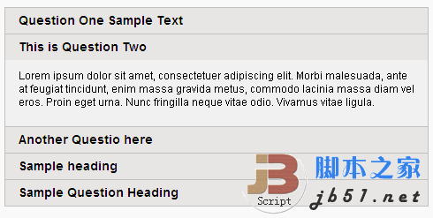 <div class="accordion"> <h3>Question One Sample Text</h3> <p>Lorem ipsum dolor sit amet, consectetuer adipiscing elit. Morbi malesuada, ante at feugiat tincidunt, enim massa gravida metus, commodo lacinia massa diam vel eros. Proin eget urna. Nunc fringilla neque vitae odio. Vivamus vitae ligula.</p> <h3>This is Question Two</h3> <p>Lorem ipsum dolor sit amet, consectetuer adipiscing elit. Morbi malesuada, ante at feugiat tincidunt, enim massa gravida metus, commodo lacinia massa diam vel eros. Proin eget urna. Nunc fringilla neque vitae odio. Vivamus vitae ligula.</p> <h3>Another Questio here</h3> <p>Lorem ipsum dolor sit amet, consectetuer adipiscing elit. Morbi malesuada, ante at feugiat tincidunt, enim massa gravida metus, commodo lacinia massa diam vel eros. Proin eget urna. Nunc fringilla neque vitae odio. Vivamus vitae ligula.</p> <h3>Sample heading</h3> <p>Lorem ipsum dolor sit amet, consectetuer adipiscing elit. Morbi malesuada, ante at feugiat tincidunt, enim massa gravida metus, commodo lacinia massa diam vel eros. Proin eget urna. Nunc fringilla neque vitae odio. Vivamus vitae ligula.</p> <h3>Sample Question Heading</h3> <p>Lorem ipsum dolor sit amet, consectetuer adipiscing elit. Morbi malesuada, ante at feugiat tincidunt, enim massa gravida metus, commodo lacinia massa diam vel eros. Proin eget urna. Nunc fringilla neque vitae odio. Vivamus vitae ligula.</p> </div>