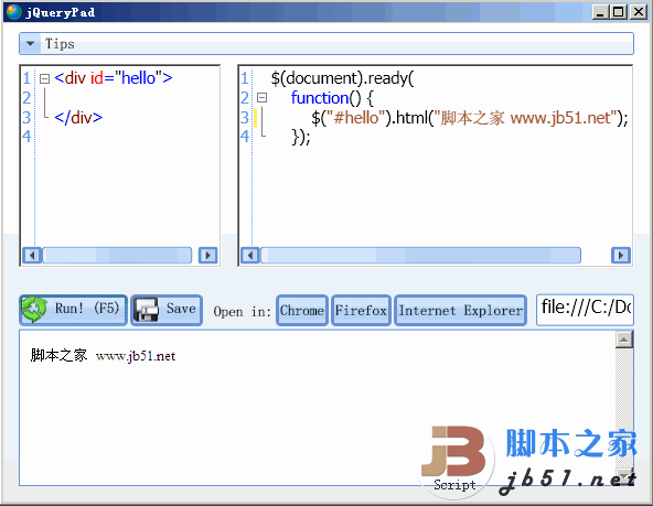 左邊為HTML的代碼,右邊為jQuery代碼,同時支持代碼折疊,語法高亮(但是就是沒有代碼提示,感覺有點不爽,不過jQuery使用的時間長了基本的熟悉後應該就無所謂了),在編寫好後就可以直接按F5就可以查看實際效果,同時可以點擊下面的chrome,ff,ie按鈕來查看在3個浏覽器中的實際效果,如果覺得可以就可以保存成HTML,jQueryPad會自動把jQuery代碼和HTML代碼合並成HTML,可以直接雙擊運行,生成的代碼如下: