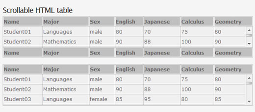 Scrollable HTML table - 將普通 HTML 表格變為可滾動狀態。將表頭部分放入 THEAD 區,內容部分放入 TBODY 區,腳注部分放入 TFOOT 區域,引用 webtoolkit.scrollabletable.js 文件,然後在每個表格後面創建 ScrollableTable() 對象即可(演示)。