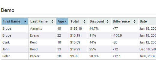 Tablesorter 2.0 - 將普通的,擁有 THEAD 和 TBODY 標簽的表格轉換為可排序表格,可以分析多種數據,支持多列排序。