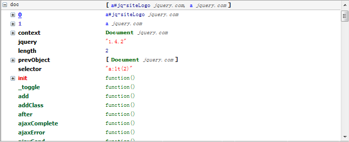 通過 doc[0]、doc[1] 可以分別取出一個 DOM 對象,其它的則是一些 jQuery 對象特有的屬性和方法;實際上 jQuery 對象包裝了 DOM 對象,同時還包含了一些操作 DOM 元素的 jQuery 方法。