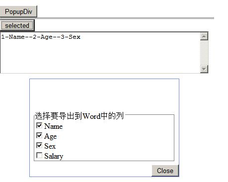 1-Name--2-Age--3-Sex--4-Salary,將這個字符串存儲在hiddenfield中,然後由JavaScript讀取,動態在彈出Div中添加checkbox對應的html,