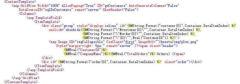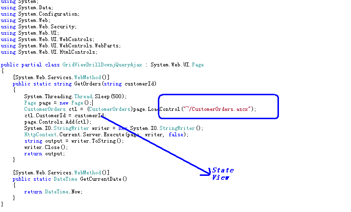 第一個圖的顯示是個Gridview,當點擊每條記錄前面的'+'時會使用jQuery的ajax功能調用一個Web Method,並傳輸一個當前產品的ID進去,然後會定義一個繼承UserControl的類,它能夠添加一個ascx文件,然後這個類裡面定義一個View State的字段。