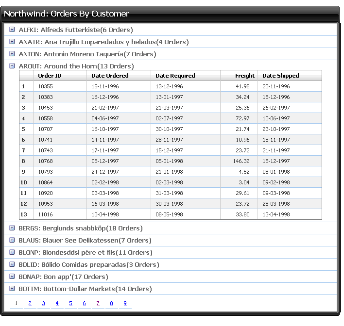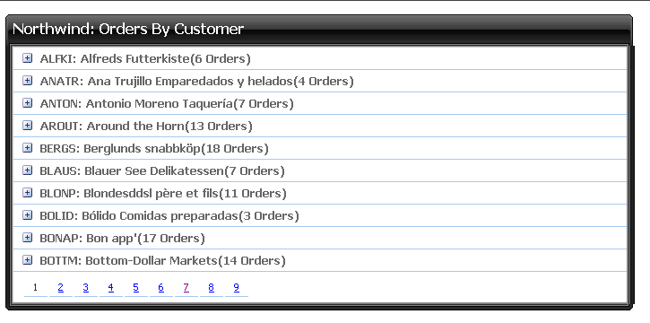 使用northwind的數據。點擊前面的加號會把其它屬於這個產品的詳細訂單展示出來,而每個產品後面都會有它的訂單個數。點擊'+'後的樣子: