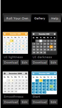 如上圖,在網頁的左側的tab欄上單擊Gallery選項,便會在下方列出Jquery官方提供的皮膚,點擊任意一套皮膚下面的Edit便會跳到Rool Your Own,在你選中的皮膚基礎上便可定制出自己想要的皮膚,定制過程是所見即所得,所有用起來很方便,定制完後,點擊Rool Your Own下方的Download theme跳到下載頁面,