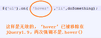 ‘hover’在jQuery1.9中被移除了(注意是’hover’,而不是.hover()),所以on方法是無法調用hover的,
