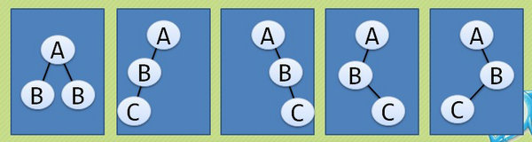 擁有三個結點的普通樹只有兩種情況:兩層或者三層。但由於二叉樹要區分左右,所以就會演變成如下的五種形態: