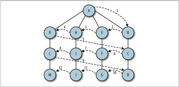 廣度優先搜索從第一個頂點開始,嘗試訪問盡可能靠近它的頂點,如下圖所示: