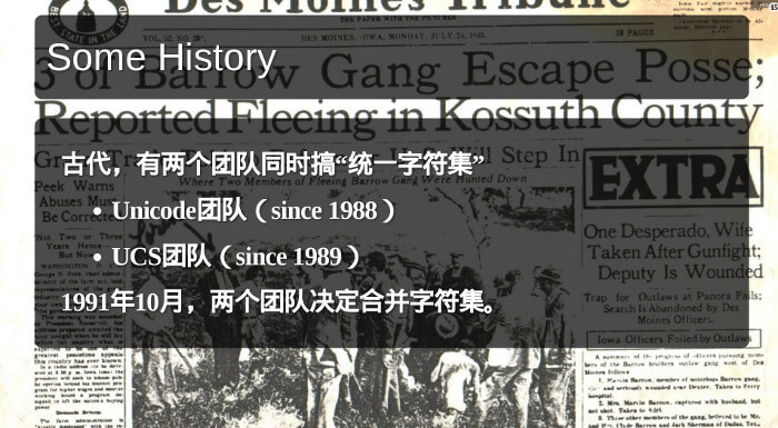 互聯網還沒出現的年代,曾經有兩個團隊,不約而同想搞統一字符集。一個是1989年成立的Unicode團隊,另一個是更早的、1988年成立的UCS團隊。等到他們發現了對方的存在,很快就達成一致:世界上不需要兩套統一字符集。