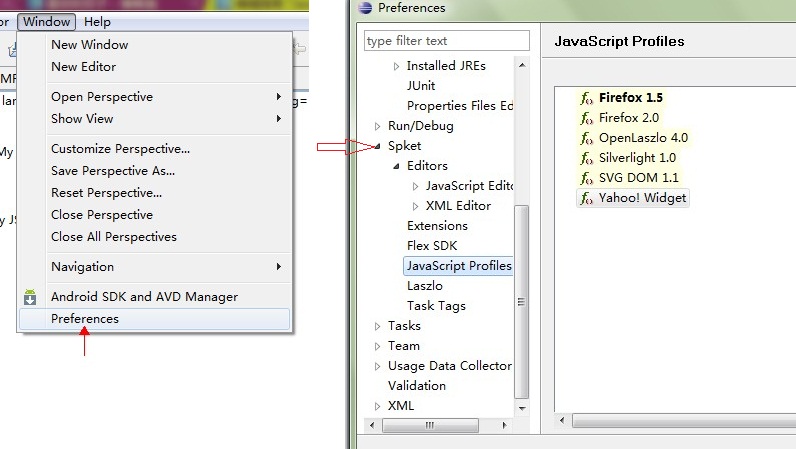 打開以後,可以看到window菜單下preference選項裡面有了spket,就是我們剛才說的插件了,至於怎麼用,今後會提到的。