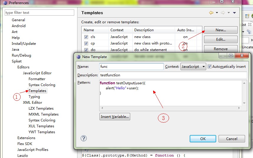 編輯js文件前我們示范下spket的用法,它可以幫助我們建立代碼模板,過程如下: