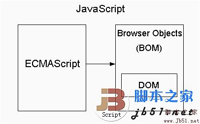 上圖是JavaScript的組成圖示,箭頭代表調用關系