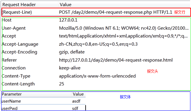 請求報文行由請求方式,請求的URL和協議版本組成,如上面第一個標記處。